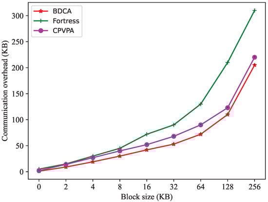 The communication overhead of BDCA in auditing data vs. CPVPA and Fortress.