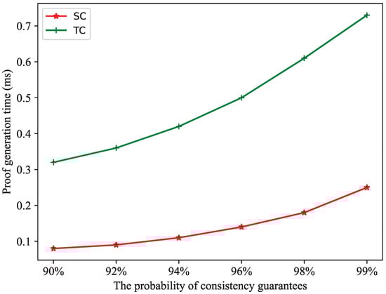 In Figure 10, our evaluation of the proof generation time under different standards (from the number of challenged blocks equals 240 to 460) of tampered data detection reveals that the number of challenged blocks is the primary determinant of the time required for proof generation. Specifically, increasing the confidence level (from 90 to 99%) [20] of data consistency guarantees leads to a substantial increase in the proof generation time for a fixed data tampering rate of 1%, emphasizing the importance of optimizing consistency guarantees to balance performance and security considerations.
