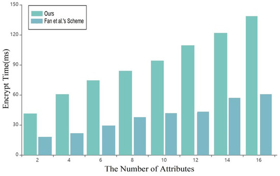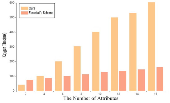 As shown in Figure 6, in the key generation stage, with the continuous increase of attributes, this scheme is superior to that in reference [7], and it will be more practical in key generation with multi-user and multi-attribute sets.