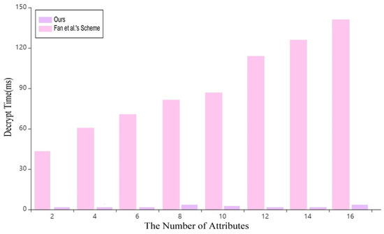 As shown in Figure 7, in the decryption stage, the scheme in this paper takes about 0~2 ms, which is far lower than the scheme in reference [7]. Therefore, it is more suitable for blockchain data sharing.