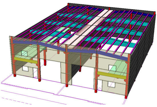 As the application of the economic results, three different hypotheses were analysed for different mix combinations on a real concrete structure model. These analyses compare the actual manufacturing mixtures with two combinations of the new proposed mixtures according to the required functionality conditions for each structural element. In this case, we analysed an industrial building model with an 890 m2 surface and 10 m pillar height of the typology shown in Figure 2.
