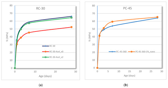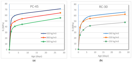 A comparative analysis for the compressive strength evolution is shown in Figure 3. These are classified by concrete types (PC-45 (Figure 3a) and RC-30 (Figure 3b)) in order to clarify the influence of the different cement content, and also to avoid a possible influence of the accelerator additive which is only included in RC-30 mixtures. For the mixtures compared, the additive rate was kept constant between the different cement steps in each concrete type, either in volume or in binder proportion.