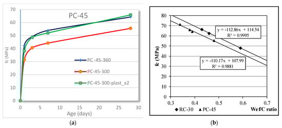 However, this hypothetical cement volume–strength interaction must be considered incorrect since it is typically deduced by comparison between mixtures with significantly different cementitious matrices, which did not actually obtain the same volume of effective mixing water, and thus yielded a different effective Wef/C ratio. Thus, if PC-45-300 and PC-45-300-plast_x2 mixtures (dosages with same cement volume but different Wef/C ratio) are now compared and also compared with PC-45-360 (with +60 kg of cement but same Wef/C ratio as PC-45-300-plast_x2), the results (Figure 4a) show that the mixtures with a similar Wef/C ratio reach a similar final compressive strength (fc28 d: 65.8 y 64.2 MPa) despite the difference of 60 kg in cement volume. However, both mixtures with the same cement volume show different strength levels (fc28 d: 55.5 y 65.8 MPa), with the values being higher for the mix with lower effective Wef/C ratio (Figure 4a). These results corroborate that the real strength level for any concrete mix is actually influenced by the Wef/C relation, which is consistent with the findings of Abrams [46], and not by the total cement volume, as can be wrongly deducted from Figure 3. This aspect is commonly misrepresented in many recommendations (different concrete manufacturers and in some concrete manufacture technical recommendations).