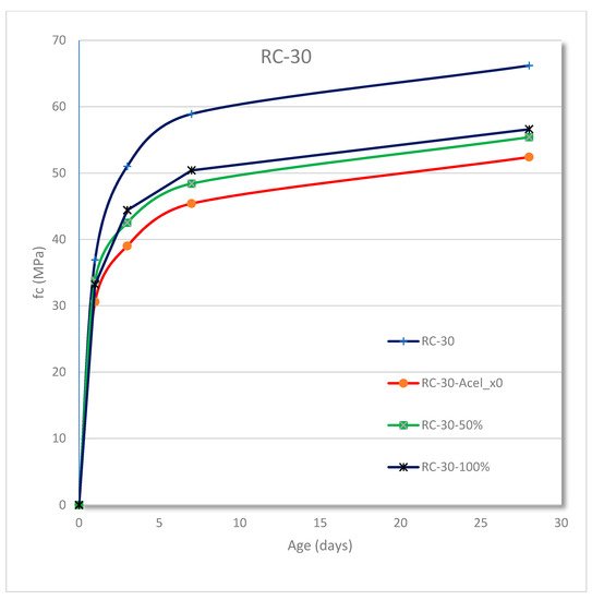 Figure 6 compares the results of the compressive strength evolution of the RAC mixtures with respect to the equivalent normal concrete (RC-30). Additionally, the normal concrete mixture without accelerator (RC-30-Acel_x0) was compared. All of these were performed using the same Wef/C ratio and dosage conditions.