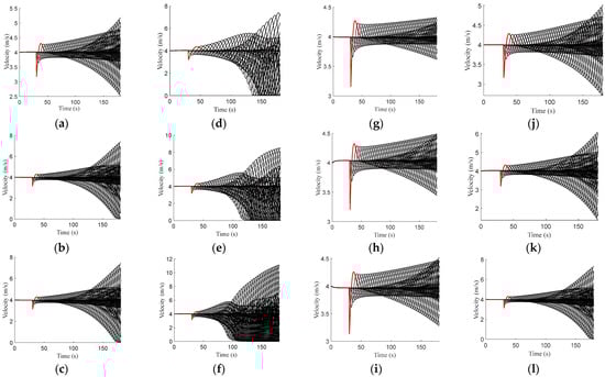 Figure 2 presents the velocity trajectories for the ID and proposed models. The trajectory of the st vehicle is represented by the red line, while the black lines indicate the trajectories of the following vehicles. For the ID model, when , the velocity of the st vehicle decreases to m/s and then increases to m/s at s. At s, the velocity oscillates between and m/s and increases over time. At s, the velocity fluctuates between and m/s as shown in Figure 2a. When , the velocity of the st vehicle decreases to m/s and then increases to m/s at s. At s, the velocity oscillates between and m/s, and at s, it fluctuates between and m/s as shown in Figure 2b. When , the velocity of the st vehicle decreases to m/s and then increases to m/s s. At s, the velocity oscillates between and m/s, and at s, it fluctuates between and m/s as shown in Figure 2c.