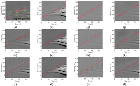Figure 3 presents the time and space evolution of the vehicles over a circular road of length m for the ID and proposed models. This shows the instability that results with both models in the form of stop and go waves. The thick red line represents the st vehicle, while the black lines correspond to the other vehicles. For the ID model, as increases, the stop and go waves propagate over time and space as shown in Figure 3a,c. For the proposed model, with (aggressive driver), the stop and go waves are larger, and with (sluggish driver), they are smaller than with (typical driver) as shown in Figure 3d,l.