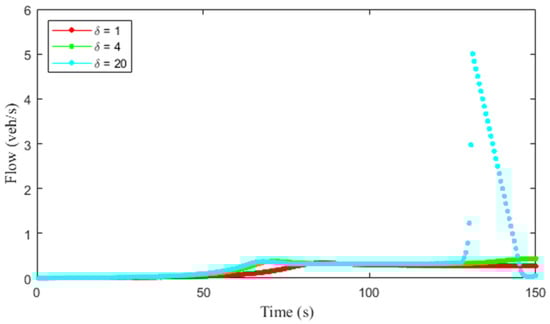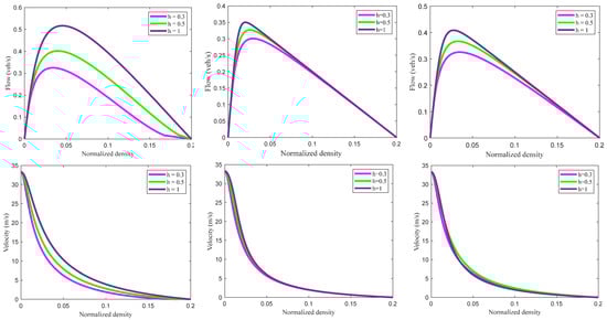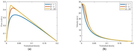 Figure 4 presents the flow and velocity with the ID model and the results are summarized in Table 4. When , the maximum flow is veh/s at a density of , and the corresponding velocity is m/s. When , the maximum flow is veh/s at a density of , and the corresponding velocity is m/s. When , the maximum flow is veh/s at a density of , and the corresponding velocity is m/s. Table 4 shows that a smaller value of results in a lower maximum flow and velocity but a larger density. As increases, the maximum flow increases, while the density decreases, whereas the corresponding velocity increases.