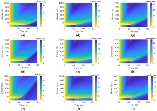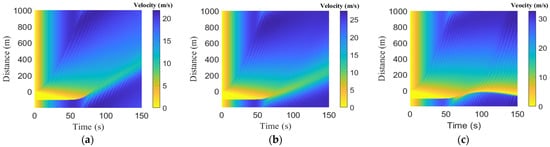 Figure 6 presents the temporal and spatial evolution of a queue for the ID model, and the congestion results are summarized in Table 6. This shows that the velocity within the queue is zero. When , the queue dissipates at s as shown in Figure 6a, and the corresponding velocity is m/s. When , the queue dissipates at s as shown in Figure 6b, and the corresponding velocity is m/s. When , the queue exists from to s, and the velocity after the queue dissipates varies between and m/s. However, a new queue forms at s and remains until s, spanning to m as shown in Figure 6c. With , the maximum velocity is m/s, whereas with and , it is and m/s, respectively. These results indicate that the traffic queue with the ID model dissipates based on the constant rather than driver response, which is unrealistic.