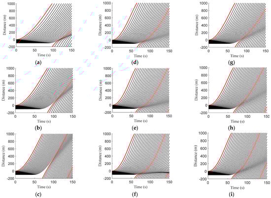 Figure 8 presents the temporal and spatial trajectories of the vehicles with the ID model, and the corresponding congestion results are given in Table 8. The thick red line represents the st vehicle, while the black lines correspond to the other vehicles. At s, with , the st vehicle is at m, while the th and th vehicles are at and m, respectively. With , the st vehicle is at m, while the th and th vehicles are at and m, respectively. With , the st vehicle is at m, while the th vehicle is at m and the th vehicle is at m. Table 8 indicates that as increases, the distance traveled by the st and th vehicles increases but decreases for the th vehicle.
