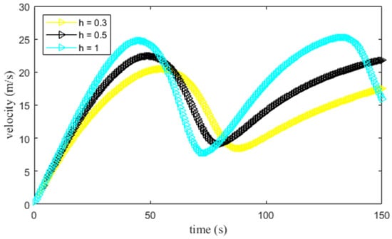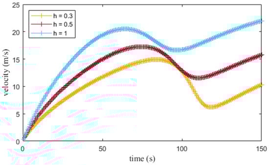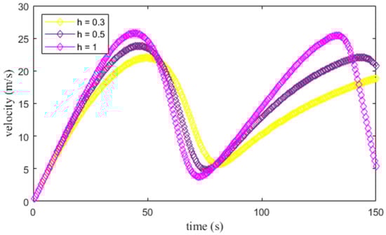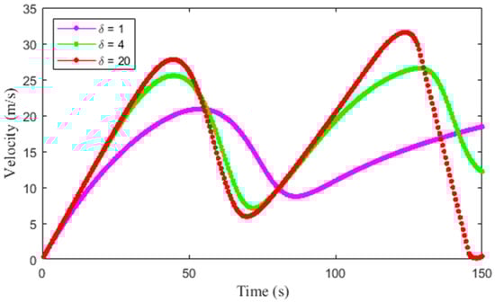 Figure 14 presents the velocity with the ID model over a m road for and . This shows that an increase in increases the variations in velocity. The corresponding velocity with the proposed model for (aggressive driver) is given in Figure 15. This indicates that the variations in velocity are smaller with a larger value of . The velocities with the proposed model for (sluggish driver) and (typical driver) are presented in Figure 16 and Figure 17, respectively. These show that the variations in velocity increase with .