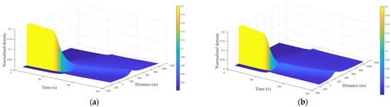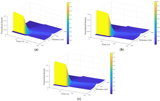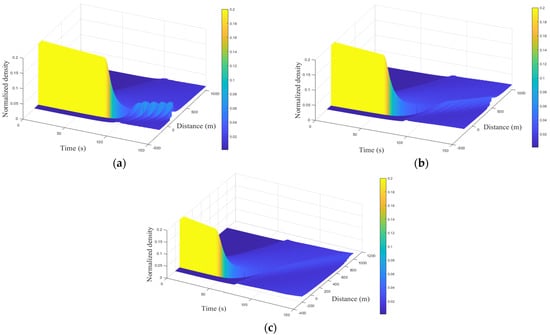 Figure 18 presents the density evolution over time and distance with the ID model. When , the density is from to m at s. At m, it is and then decreases to at m as shown in Figure 18a. From to s, there is a traffic queue as the density is . At s, the density at s decreases to after the congestion ends. When , at s the density is from to m. It increases to at m and then decreases to at m as shown in Figure 18b. From to s, the density is , which indicates a traffic queue. At s, the density decreases to . When , at s the density between m and m is which indicates a traffic queue. At m, it decreases to as shown in Figure 18c. It is from to s, so there is a traffic queue. The density then decreases to at s. A queue again develops at s as the density is and remains until s between and m. Figure 18 shows that as increases, the change in density over time increases, which indicates the model is unstable.