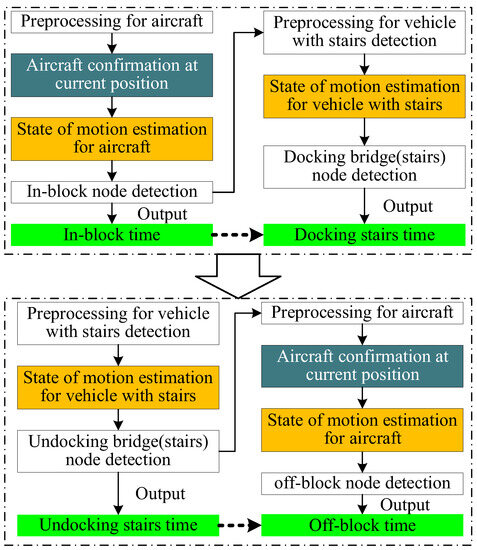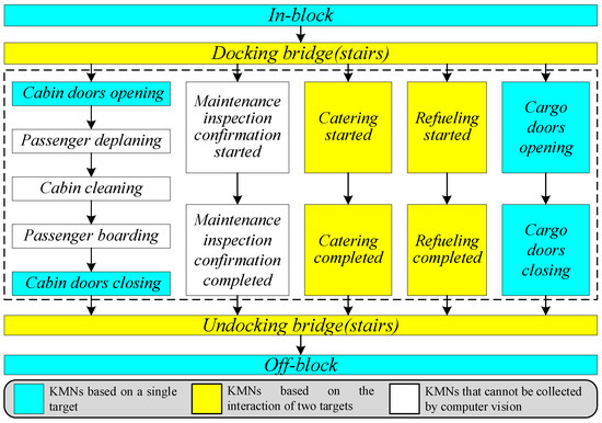 Aircraft turnaround can be defined as the process that unfolds from unloading an aircraft after its arrival until the departure of that aircraft as a new flight [1]. Depending on the regulations of Airport Collaborative Decision Making (A-CDM), the turnaround process can be quantified into a series of key milestone nodes (KMNs) [2,3]. The first KMN of an aircraft’s turn is referred to as the in-block node when the aircraft arrives at the parking position and after the chocks are set. The turnaround process ends when the aircraft is ready to depart. This end-time node is called an off-block node. In the period from the in-block time to the off-block time, there are several KMNs (shown in Figure 1) corresponding to different flight ground handling processes, such as catering, fueling, cabin opening and closing, and passenger deplaning and boarding. In recent years, the International Civil Aviation Organization (ICAO) and civil aviation authorities around the world have been vigorously improving the efficiency and resilience of airport operations by optimizing the use of resources and improving the predictability of air traffic and airport ground activities [4]. KMNs play a considerable role in airport planning, including schedule planning, fleet planning, and operation planning [5]. Therefore, collecting and recording node information by adopting automatic approaches can also improve the efficiency and quality of aircraft turnarounds. In this paper, a computer vision-based framework is established for the automatic collection of KMNs during the process of aircraft turnaround. The proposed framework automatically identifies the flight in/off-block and docking/undocking activities and records the corresponding KMNs, instead of employing the manual recording method used daily.