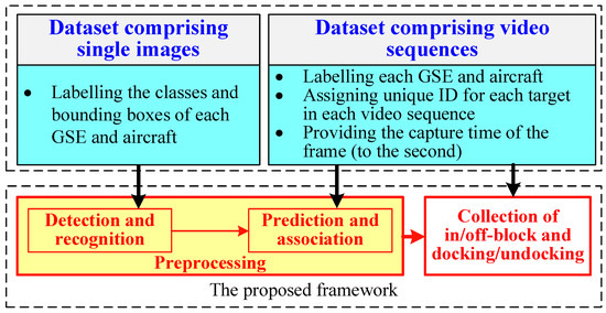 To complete the training and testing of the algorithms and the proposed framework, two datasets are constructed and presented. The first dataset consists of a large number of single-frame images, with the GSE and aircraft in each image being manually labeled using bounding boxes, and is used to train and evaluate the algorithm of the detection and recognition. The second dataset consists of video sequences of ground surveillance recorded at different times on two fixed stands at Beijing Capital International Airport and is used to evaluate the algorithm of object prediction and association as well as the collection of KMNs. In the second dataset, the bounding boxes and distinct IDs of each GSE and aircraft in each frame are also manually labeled for object prediction and association evaluation. Moreover, in the top left corner of each frame, the time (to the second) at which the frame was captured is displayed as the label to evaluate the collection of KMNs. The relationship between the datasets and each component of the proposed framework is shown in Figure 2.