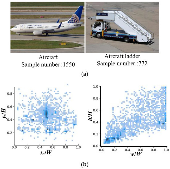 To detect and identify executors of KMNs during the turnaround process, a dataset consisting of 3175 images was first constructed. The dataset mainly contains civil aircraft and mobile aircraft landing stairs. Their numbers are presented in Figure 3a. To reflect a realistic airfield operational environment, images of the dataset cover several special cases, such as multi-scale changes in the targets, different visibilities, and occlusions. All targets are labeled manually, and each ground truth includes the location of the bounding boxes and their class names. The location and scale distribution of the objects in the dataset are shown in Figure 3b. This figure shows that the objects to be detected are mainly distributed in the central region of the image, and the scale distribution of the instances is relatively uniform.