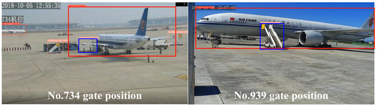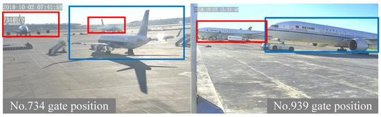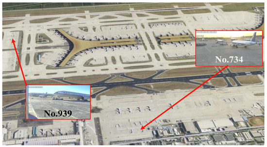 Original videos of this dataset were captured by surveillance cameras of two remote stands (No. 734 and No. 939) at Beijing Capital International Airport shown in Figure 4. The field of view of the camera at No. 734 is much larger than that of the camera at No. 939. The dataset contains 42 individual video sequences. Table 2 presents the distribution of video sequences. The frame index corresponding to the time of occurrence of the KMN is manually recorded as the ground truth to evaluate the proposed framework. The frame rate of the original video is 30 frames per second (fps). Owing to the relatively low speed of the aircraft and the motion of the various working vehicles in the surveillance video, not only does lowering the frame rate not affect the performance of the proposed framework but also it reduces memory consumption and improves operational efficiency to a certain extent. To this end, the original surveillance video is sampled at 5 fps, and each sequence of the dataset contains an average of 300 frames with a resolution of 1920 × 1080 pixels.