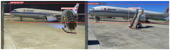 Unlike in-block and off-block node detection, which only needs to focus on the movement of the aircraft at the current position, docking and undocking stairs node collection needs to determine the movement of the mobile aircraft landing stairs while also analyzing the positional relationship between the mobile aircraft landing stairs and the parked aircraft. Condition 1 of Equation (10) can be used to determine the movement of the mobile aircraft landing stairs. Figure 8 reveals that the bounding boxes of the movable aircraft landing stairs are contained in the bounding box of the parked aircraft. Therefore, in order to represent the position relationship between the mobile aircraft landing stairs and the parked aircraft, the index IoUav is proposed and expressed as