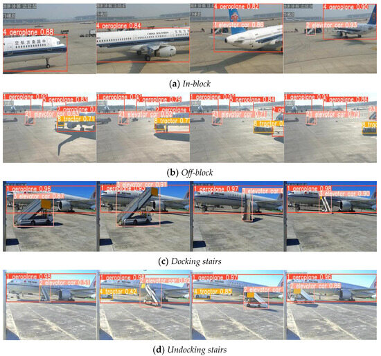 In Equation (9), the threshold Ta for the aircraft and Tv are set at 0.95 and 0.9, respectively. We select eight sets of video sequences from the dataset for experiments. These sequences consist of four types of KMN: in-block, off-block, docking stairs, and undocking stairs. The results of the quantitative assessment for eight test samples are given in Table 5. The experimental results show that the sub-module of the prediction and association used in our framework has only 33 ID switches owing to target association errors, whereas there are a total of 8397 objects detected. Specifically, the association success rate is high, with the average MOTA of 95.09%, and the localization accuracy is high, with the average MOTP of 92.63%.