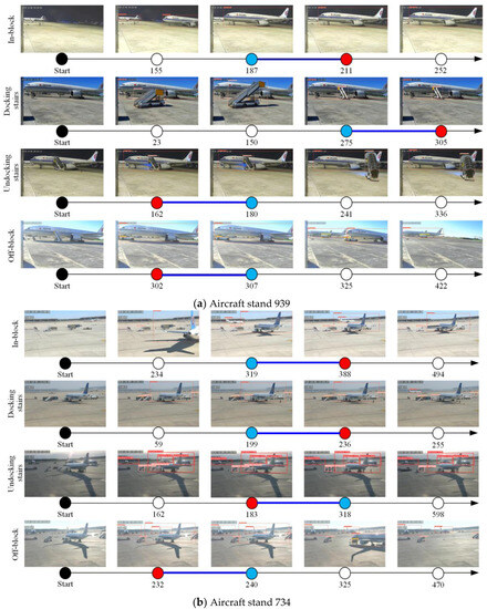 Results of quantitative evaluation are listed in Table 6. Figure 11a,b show the results of the collection of the four types of KMN at aircraft stands 939 and 734, respectively. In the figure, each time axis represents a time series in terms of the number of frame. The time axis is labeled with the origin and the total number of frames, and the predicted nodes of activity occurrence are shown as red dots, the actual nodes of activity occurrence are shown as blue dots, and the white dots are the process nodes of activity occurrence. The following observations are made from the aforementioned results. First, the error is largest for the in-block node. This is because aircraft have a larger bounding box compared with vehicles, making it more difficult to determine changes in aircraft movement. Second, the error at position 734 is slightly higher than that at position 939. This is due to more interference around position 734, which is farther away from the camera, and less interference around position 939, where the positioning information is more accurate. Third, the timing error in the automatic collection of KMNs is well below 60 s, as required by the A-CDM system. To sum up, since all of these test samples were from the 734 and 939 aircraft positions at Beijing Capital Airport, we believe that the proposed framework can be applied directly to KMN collection of these two aircraft stands.