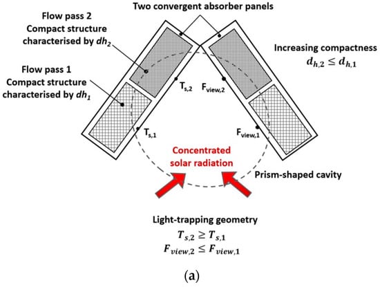 Schemes in use of the microchannel central solar receiver: (a) top view of one of the prism-shaped cavities formed between two consecutive and converging absorber panels; (b) projected view of one of the prism-shaped cavities, distinguishing in the same absorber panel two fluid flow passes with increasing compactness.
