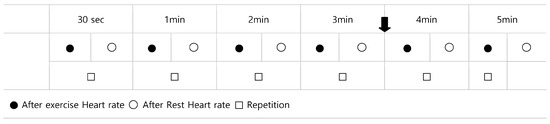 The subject’s heart rate was measured in a chair position, using a radio heart-rate-measuring device (Polar S610i), and each was measured 7 times immediately after each set of exercises and after the rest time, according to 6 rest interval conditions (30 s, 1 min, 2 min, 3 min, 4 min, and 5 min).