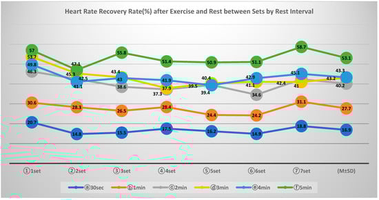 The result of the change of heart rate recovery rate according to the rest interval 6 conditions and 7 sets are the same as in Table 6. The heart rate recovery rate (%) was calculated by subtracting the heart rate after rest from the heart rate after exercise, multiplying it by 100, and dividing it into the heart rate after rest. The relationship between heart rate recovery rate and exercise performance ability was examined. The Heart rate recovery rate (%) by rest interval condition showed a statistically significant difference between sets 1 and 2 and sets 6 and 7 (p < 0.039), and heart rate recovery by set progression also showed a statistically significant difference between sets 1 and 2 and sets 6 and 7 (p < 0.026). The interaction effect between set and rest interval condition also showed a statistically significant (p < 0.000) difference. As shown in Table 6 and Figure 7 and Figure 8, the rest interval condition and the heart rate recovery rate (%) according to the set progression were found to have an effect on both the rest interval condition (ES ≥ 0.37) and the set (ES ≥ 0.37). However, the heart rate recovery rate (%) was found to be due to a larger interaction effect size (ES ≥ 0.49) by the rest interval condition and the set progress.