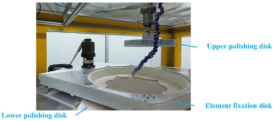 The RDP is presented in Figure 1. It mainly comprises the lower-polishing disk with rotation pedestal, the element fixation disk, and the upper-polishing disk. The optical element is positioned on the element fixation disk, and the lower-polishing disk polishes the lower surface through rotation. The upper disk and the element-fixation disk polish the optical element’s upper surface by rotational and radial-feed motion simultaneously.
