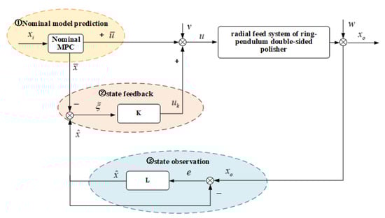 The structure consists of three parts: nominal model predictive control, state estimation, and state feedback. The identification system model is utilized for the nominal MPC optimization. represents the estimated state of the system, which is obtained through the utilization of the estimation matrix L. The total control volume of the single-tube robust predictive controller consists of the nominal model predictive control (MPC) and the feedback control. Moreover, the system state gradually approaches the origin under the influence of the control quantity.