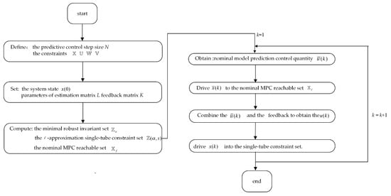 , , , and in Equation (3) are constrained by Equation (4). , , , and represent the constraint sets containing the origin. Equation (5) describes the nominal MPC system, which excludes the disturbances and . is the nominal prediction state . is the nominal model prediction control quantity.
