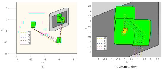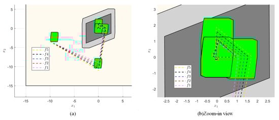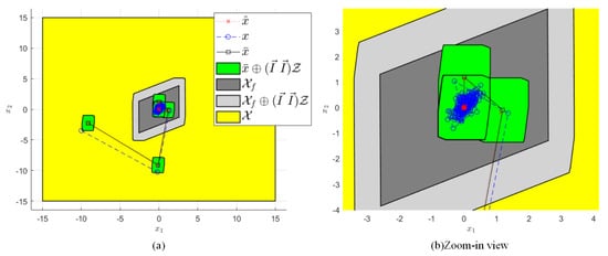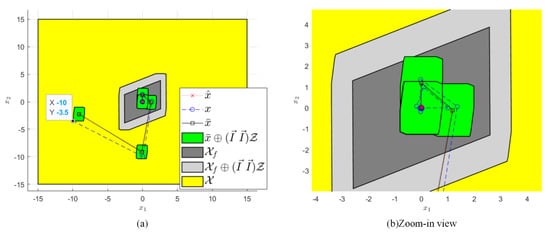is the Minkowski sum in the following formulas, where represents the operation symbol. The terminal constraint set for and is designed by utilizing the minimal robust invariant set. According to Equations (14)–(16), we can obtain the constraint set for and the constraint set for .