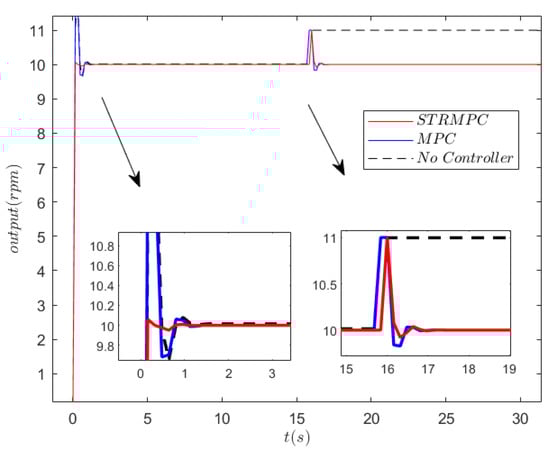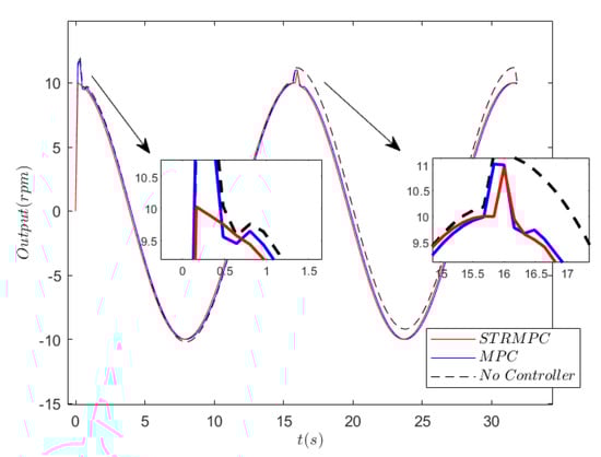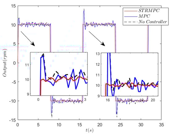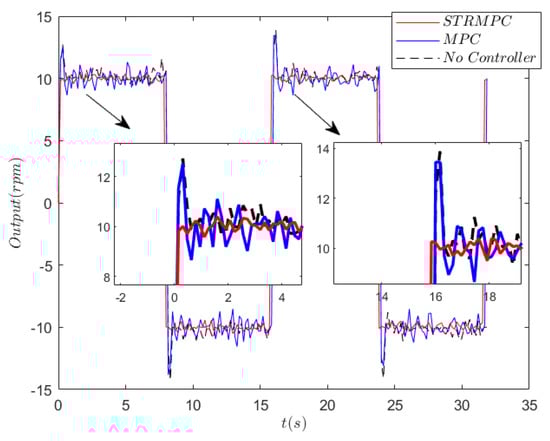 We set step, sine, and square wave with amplitudes of 10 rpm and periods of 16 s as input signals. We separately added noise and load disturbances to the system output to validate the proposed method’s disturbance rejection capability. The initial system states for the STRMPC and MPC were defined as . We used the integral of the time-weighted absolute error (ITAE) performance index to evaluate the control performance.