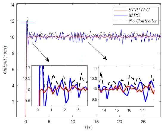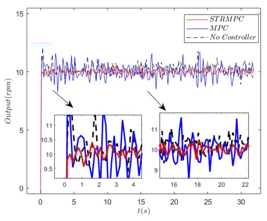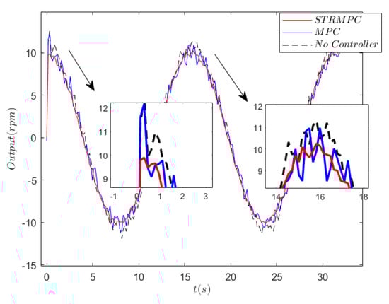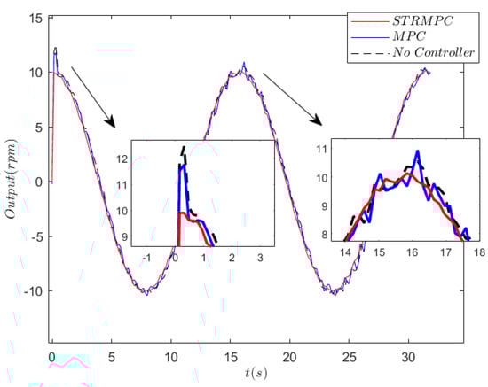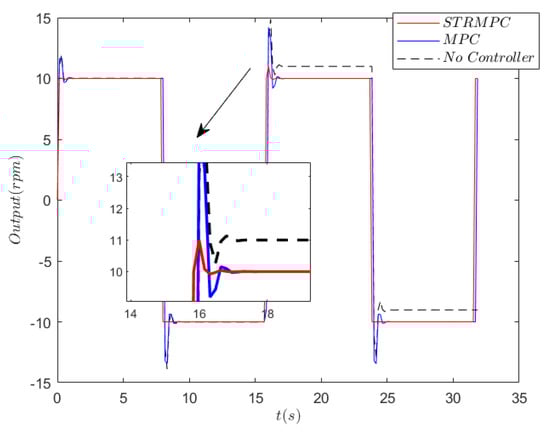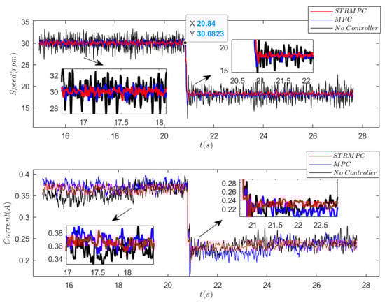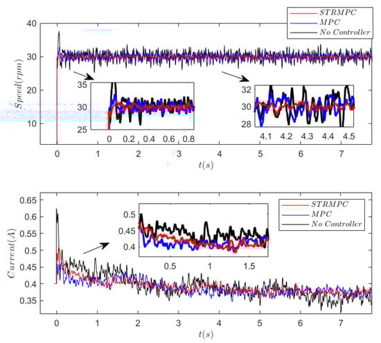 The experimental results indicate that the STRMPC displays outstanding robustness in Figure 21; the speed of the system with STRMPC has fewer steady errors than the speed outputs of comparison, and hardly produces the overshoot. The better control performance can be attributed to the STRMPC’s capability to restrict the output error through the single-tube terminal constraint set, as confirmed by the simulation results. The current curve in Figure 20 also verifies the robustness of the proposed method. Figure 22 demonstrates that when the speed changes abruptly, the proposed method has the more stable speed curves, which reflects its advantage in terms of robustness.
