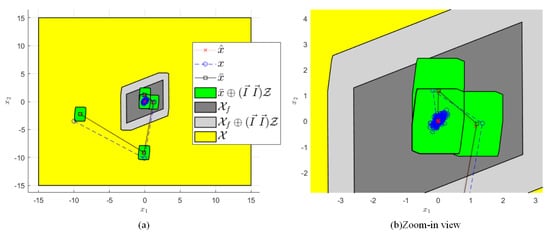 Combining the calculation of minimal robust invariant set in Reference [] and Equations (14) and (15), we can obtain the minimal robust invariant sets and .