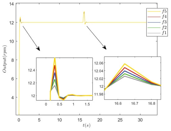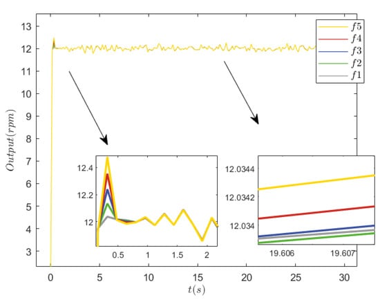 The step response results in Figure 17, Figure 18, Figure 19 and Figure 20 show that the output of different models is nearly identical and that the model parameters uncertainty has little influence on the system performance. The results in Table 6 demonstrate that the STRMPC method exhibits high control effectiveness and robustness against model parameter fluctuations, load changes, and noise interference. The ITAE index remains relatively stable for the load disturbance test, with a maximum value increase of only 0.1359 from f1 to f5. Similarly, for the noise interference test, the ITAE index shows minimal increase, with a maximum value increase of only 0.1255 from f1 to f5. These results highlight the ability of the STRMPC method to maintain accurate control performance, demonstrating its robustness and effectiveness in achieving high-precision control.