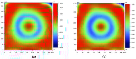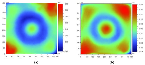 In the surface processing experiment, we chose a fused silica optical glass with dimensions of 430 × 430 mm and a thickness of 10 mm. The polishing pressure was set at 200 N, and the upper polishing disk had a radial displacement range of 20 mm relative to the center of the fused silica optical glass. Both the polishing disk and the glass were rotated at a speed of 15 rpm. Each piece of fused silica optical glass was then polished for a duration of 30 min. Surface shape detection was performed before and after processing; the peak-to-valley (PV) and root-mean-square (RMS) indices are presented in Figure 23 and Figure 24.
