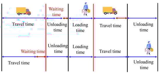 A cold chain network involves several processes that a product must go through from supplies to retail stores. Firstly, the product is delivered to the logistics companies, where it undergoes the first travel time. Once it arrives at the logistics company, the product is unloaded and awaits loading until all goods have arrived for transportation. Afterward, the product undergoes the second travel time to reach the retail stores. The service time of the entire cold chain network is illustrated in Figure 1.