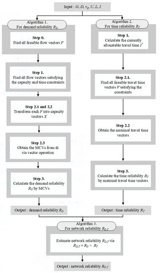 An algorithm to evaluate the network reliability for an SCCNMT model under time constraint I is proposed as follows (Algorithms 1–3):