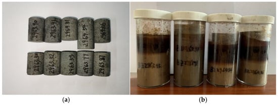 The hydration of drilling fluids causes inter-particle swelling of clay minerals [14]. The significant presence of clay minerals in weak interlayer igneous necessitates the collection of drilling fluids used in the field for hydration tests. These tests aim to determine the effect of rock soaking time on the strength parameters of rocks containing weak layers [15]. Figure 2a presents igneous cores obtained from the core bank at a depth of 2963~2964 m, with a regular cylindrical rock sample measuring 25 mm × 50 mm. Figure 2b depicts the drilling fluid immersion test, utilizing a modified PEC drilling fluid.