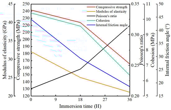 Variation of key mechanical parameters of igneous rock with soaking time.