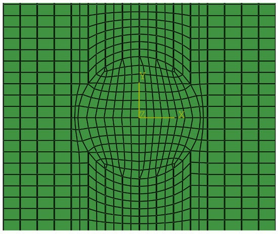 Once the geometric model is created, the four outer boundaries are fixed and the corresponding pressure boundaries are defined. Additionally, a pore pressure boundary is applied within the model, considering the internal fluid to be incompressible. The numerical analysis model of wellbore stability was constructed using ABAQUS. The borehole area and weak interlayer were accurately defined in the model, and the comprehensive model depiction results are presented in Figure 6.