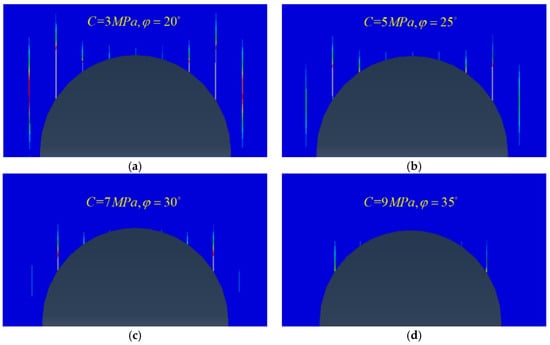 Plastic strain under different strength parameters of weak interlayer. (a) C = 3 MPa, = 20°; (b) C = 5 MPa, = 25°; (c) C = 7 MPa, = 30°; (d) C = 9 MPa, = 35°.