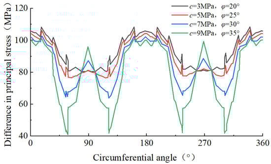 Based on the model parameters, four different sets of cohesion (C) and friction angle () parameters were selected: 3 MPa at 20°, 5 MPa at 25°, 7 MPa at 30°, and 9 MPa at 35°. The results of the well perimeter stress calculations are shown in Figure 9.