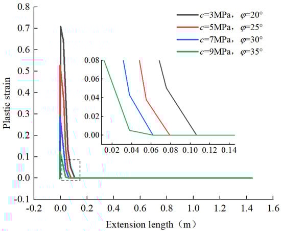 Variation of plastic strain with extension length under different strength parameters of weak interlayer.