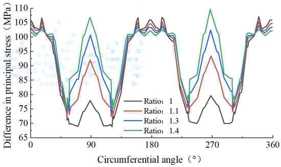 The horizontal in situ stress ratio serves as an indicator of the level of anisotropy in the horizontal in situ stress. The maximum and minimum principal stresses on the wellbore were extracted for different horizontal in situ stress ratios (1, 1.1, 1.3, and 1.4), and the variation of the stress difference with the horizontal in situ stress ratio is presented in Figure 13.