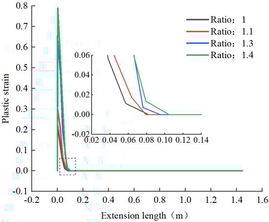 The plastic strains within the longest extension region were extracted for models with different horizontal in situ stress ratios, and the results are presented in Figure 14.