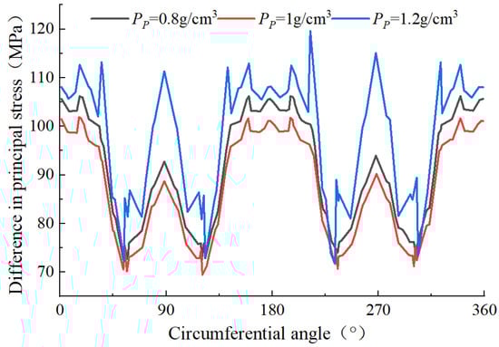 To simulate formation anomaly pressure, the model underwent changes in the formation pore pressure. Three sets of formation pore pressure equivalent densities (0.8 g/cm3, 1 g/cm3, and 1.2 g/cm3) were utilized to investigate the impact of formation anomaly pore pressure on wellbore stability. Figure 15 illustrates the maximum and minimum principal stress differences corresponding to different formation pore pressures.