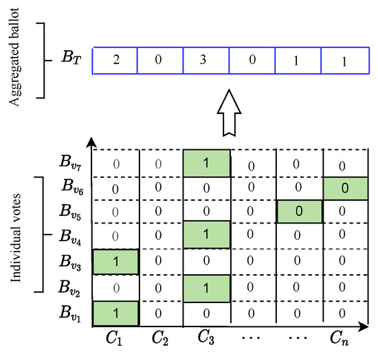 The individual ballot format and the aggregated ballot. The sum of the i-th element in the ballot gives the number of votes for the candidate . (Author’s own processing).