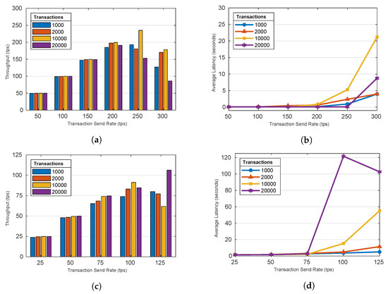 Figures shown in Figure 6 illustrate the average throughput and latency for GetBallot and CastVote functions for varying total numbers of transactions. The results indicate that there is no significant impact on total number of transactions, as long as the send rate remains below the scheme’s peak throughput. As send rates increase beyond the peak throughput, the impact of the number of transactions increases. As seen in Figure 6a,b, an increase to the transaction send rate before reaching the peak throughput of approximately 200 tps for GetBallot does not result in different throughput or latency between different volumes of total transactions. After the peak throughput is surpassed differences in performance emerge depending on the total transaction volume. There is not a clear relationship between transaction count and how throughput degrades after the send rate surpasses optimal throughput. For GetBallot, we observed that the throughput at high send rates was generally better for a total of 1000 tx than 20,000 tx, but this was not the case for CastVote. This could result from inconsistencies that arise in performance when max throughput is exceeded. For average latency, the impact of transaction count is more clear. As seen in Figure 6c,d, there is an increase in latency as the transaction count increased for CastVote. This is also seen in Figure 6a,b for GetBallot, with the exception of the observed latency at 20,000 total transactions, which is lower than the latency at 10,000 tx. These results are generalized as follows: