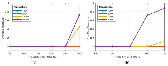 Varying transaction send rates’ impact on Transaction Error Rate. (a) GetBallot; (b) CastVote. (Author’s own processing).