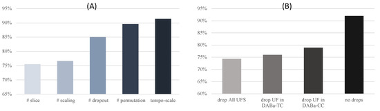 To further prove the effectiveness of our TIA (tempo-scale strategy) module, we compared our method with the other four augmentation strategies: slice, scaling, dropout, and permutation. The classification accuracy comparisons of different augmentations on the HAR dataset are illustrated in Figure 4A. The proposed tempo-scale strategy has the best performance in average accuracy, which demonstrates that the discriminating representations are learned using tempo-scale transformation augmentation. Further, considering the random transformation with the same augmentation method generates two similar views, our TIA generates views with more information entropy. Previous studies consider the dropout strategy to be the best augmentation. However, when the DAB is aware, more discriminative features are constructed, and the model can achieve better performance. Though the augmentation process introduces the DAB, it can be perceived and minimized by the DABa-TC and DABa-CC modules, which means the TIA is more stable for the DABaCLT framework.