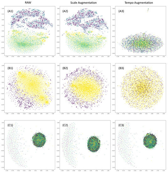 Spatial distribution visualization of signals with T-SNE method. Spatial distribution of (A1) the raw, (A2) scale-augmented, and (A3) tempo-augmented signals in HAR dataset; spatial distribution of (B1) the raw, (B2) scale-augmented and (B3) tempo-augmented signals in ESR dataset; spatial distribution of (C1) the raw, (C2) scale-augmented, and (C3) tempo-augmented signals in SleepEDF dataset.